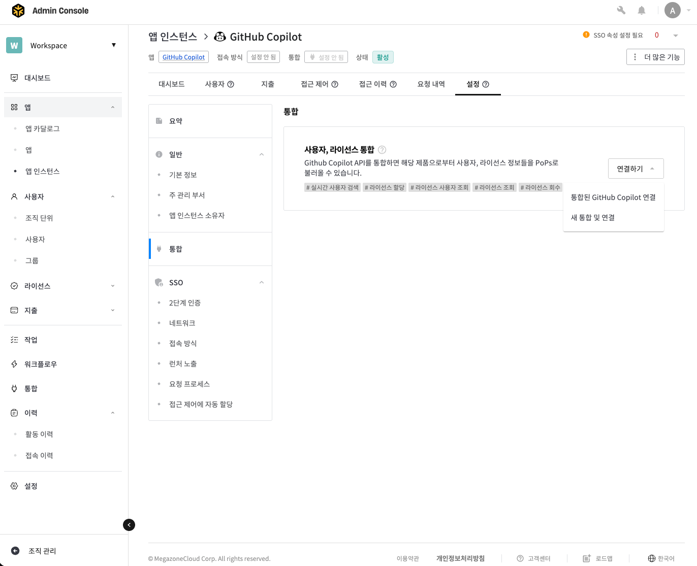 앱 인스턴스 상세 페이지에서 [설정] 탭으로 이동하여 사용자, 라이선스 통합의 [연결하기] 버튼을 클릭하여 기존 통합과 연결하거나 새 통합을 만들어 연결합니다.