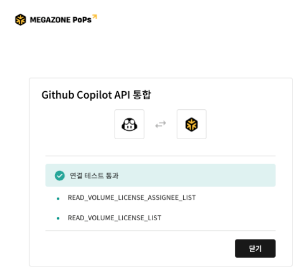 GitHub Copilot API를 사용하기 위한 권한이 충분히 부여되어 있으면 API 통합 다이얼로그에서 '연결 테스트 통과'로 표시됩니다. 연결 테스트에 통과한 상태에서 [통합하기]를 클릭하면 API 통합이 완료됩니다.