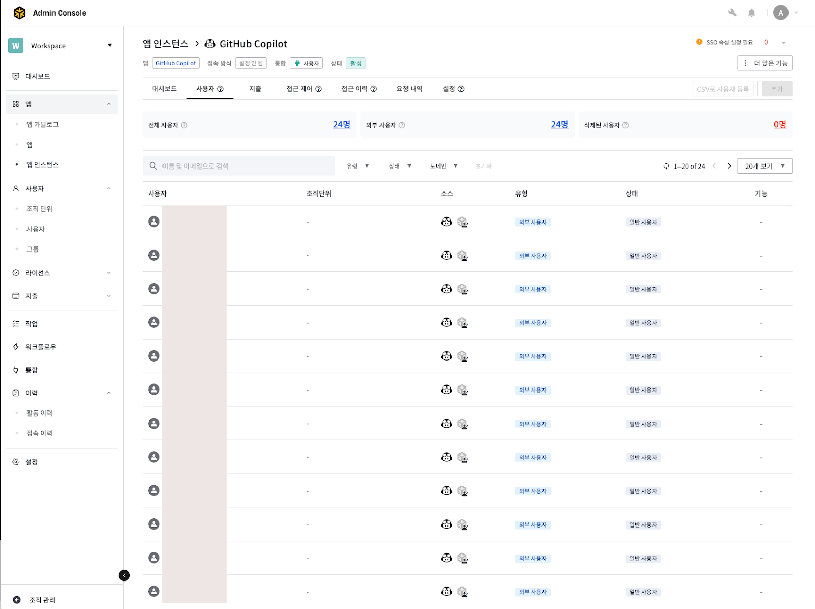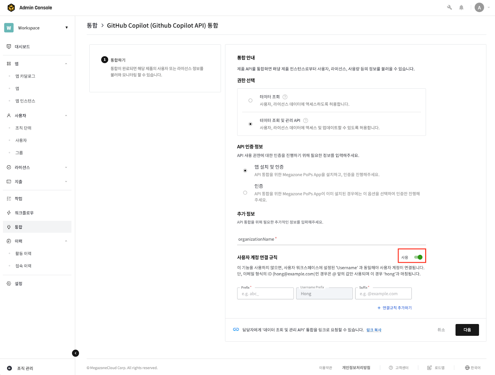 사용자 계정 연결 규칙을 [사용]으로 활성화하고 규칙을 설정하면 해당 규칙에 따라 워크스페이스의 username과 GitHub Copilot의 username을 매칭하여 사용자 계정을 연결합니다. 예를 들어, Prefix를 “abc_”, Suffix를 “@example.com”으로 연결 규칙을 설정하면 워크스페이스의 username이 hong@example.com인 사용자는 GitHub Copilot의 username이 hong인 사용자와 계정이 연결됩니다. 사용자 계정 연결 규칙은 [+연결규칙 추가하기] 버튼을 클릭하여 여러개 등록할 수 있습니다.