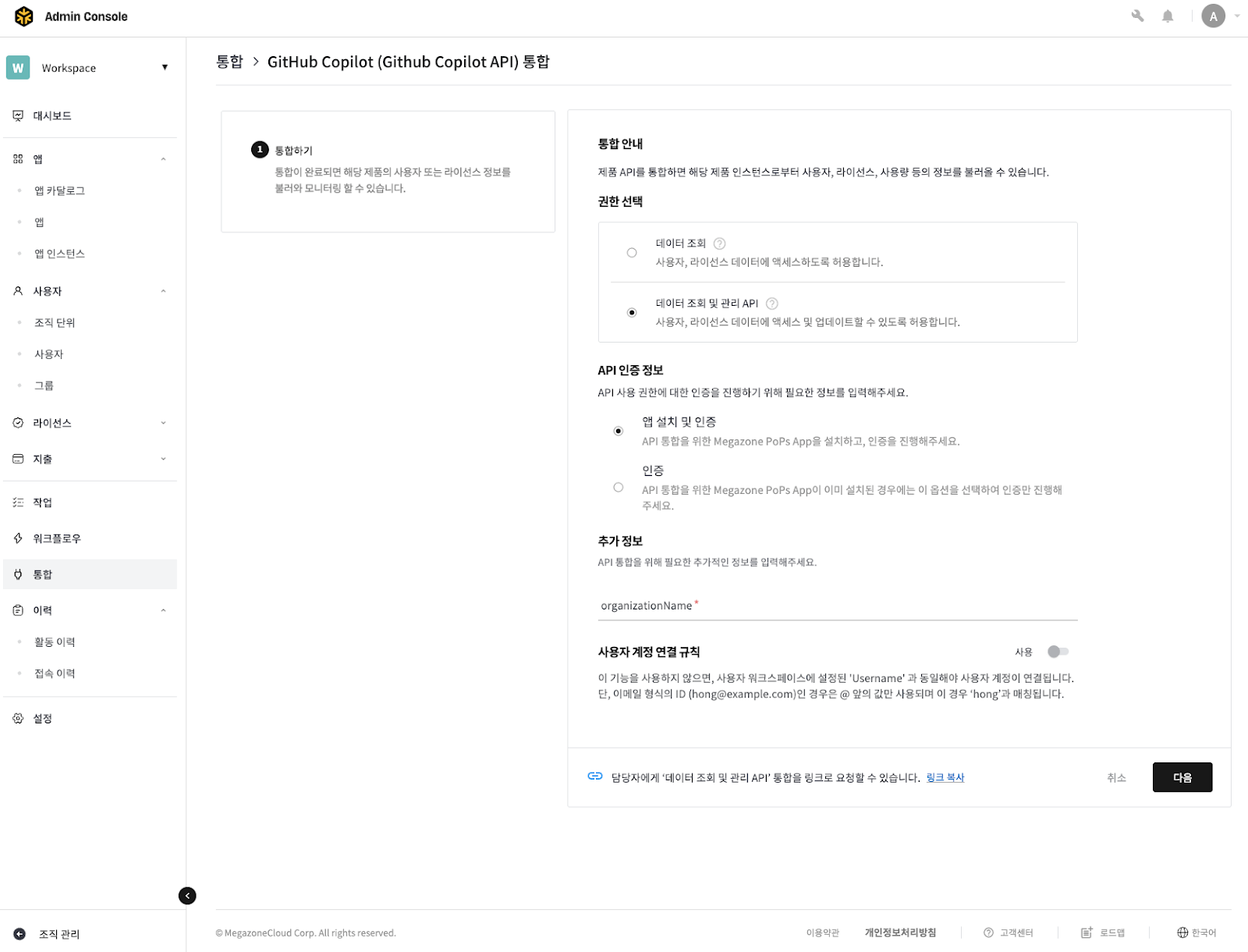 - 앱 설치 및 인증: GitHub 조직에 API 통합을 위한 Megazone PoPs 앱이 설치되어 있지 않은 경우, 해당 옵션을 선택합니다.