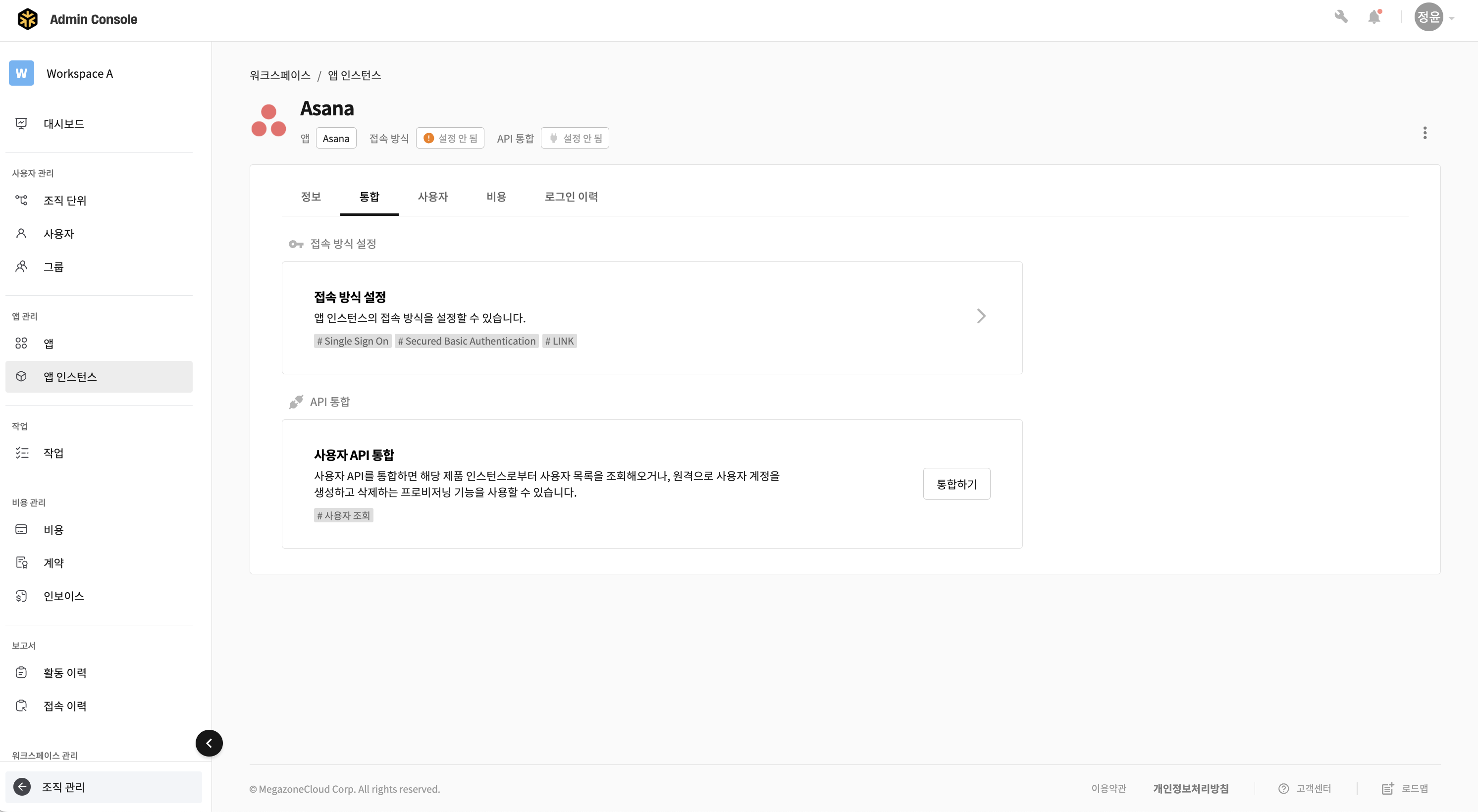 - Asana 앱 인스턴스 상세 페이지에서 [통합] 탭으로 이동하여 User API의 [통합하기] 버튼을 클릭합니다.
