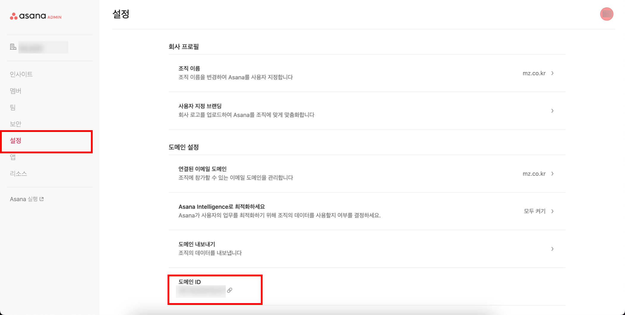 3. Admin console > [설정] 메뉴에서 도메인 ID를 복사합니다.