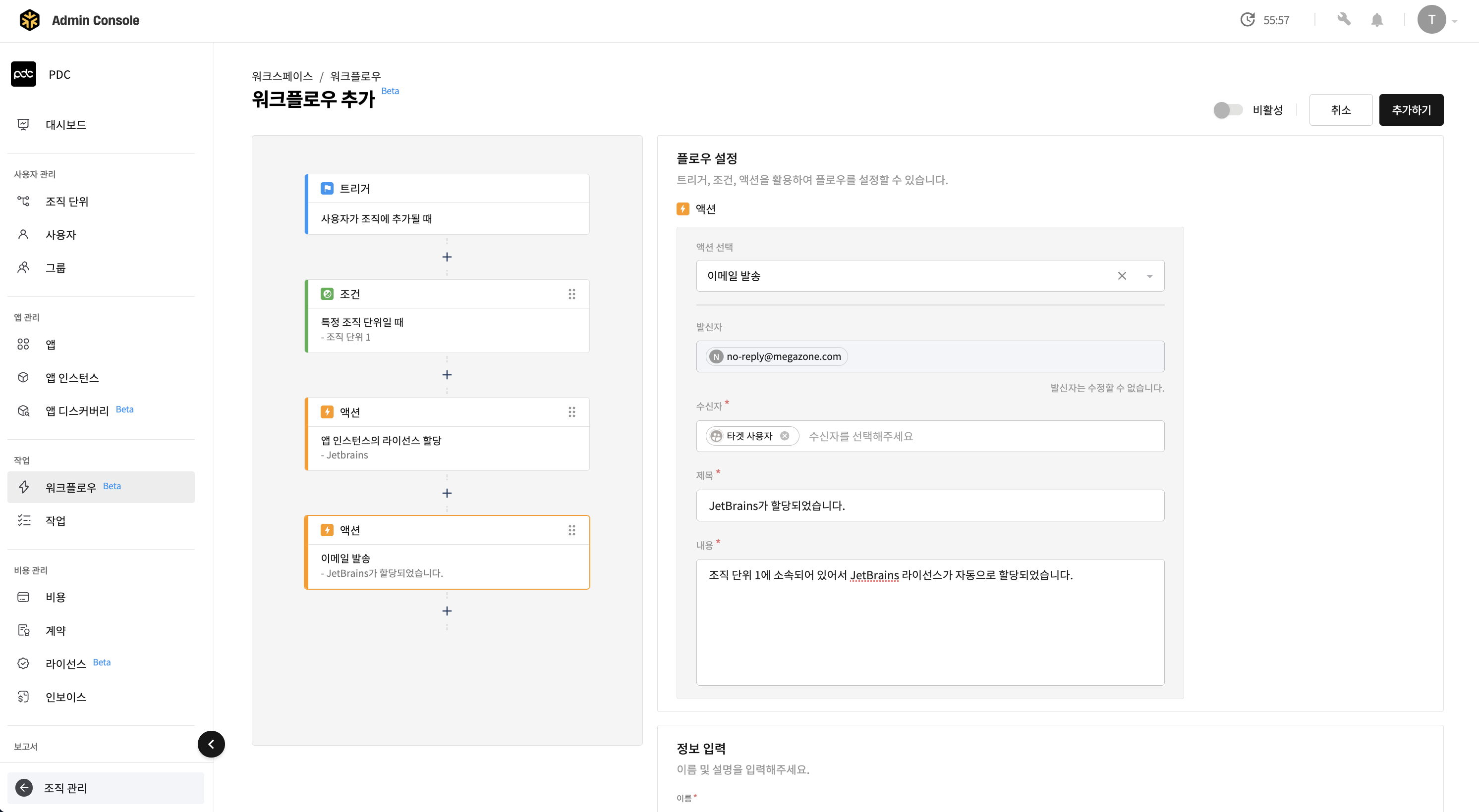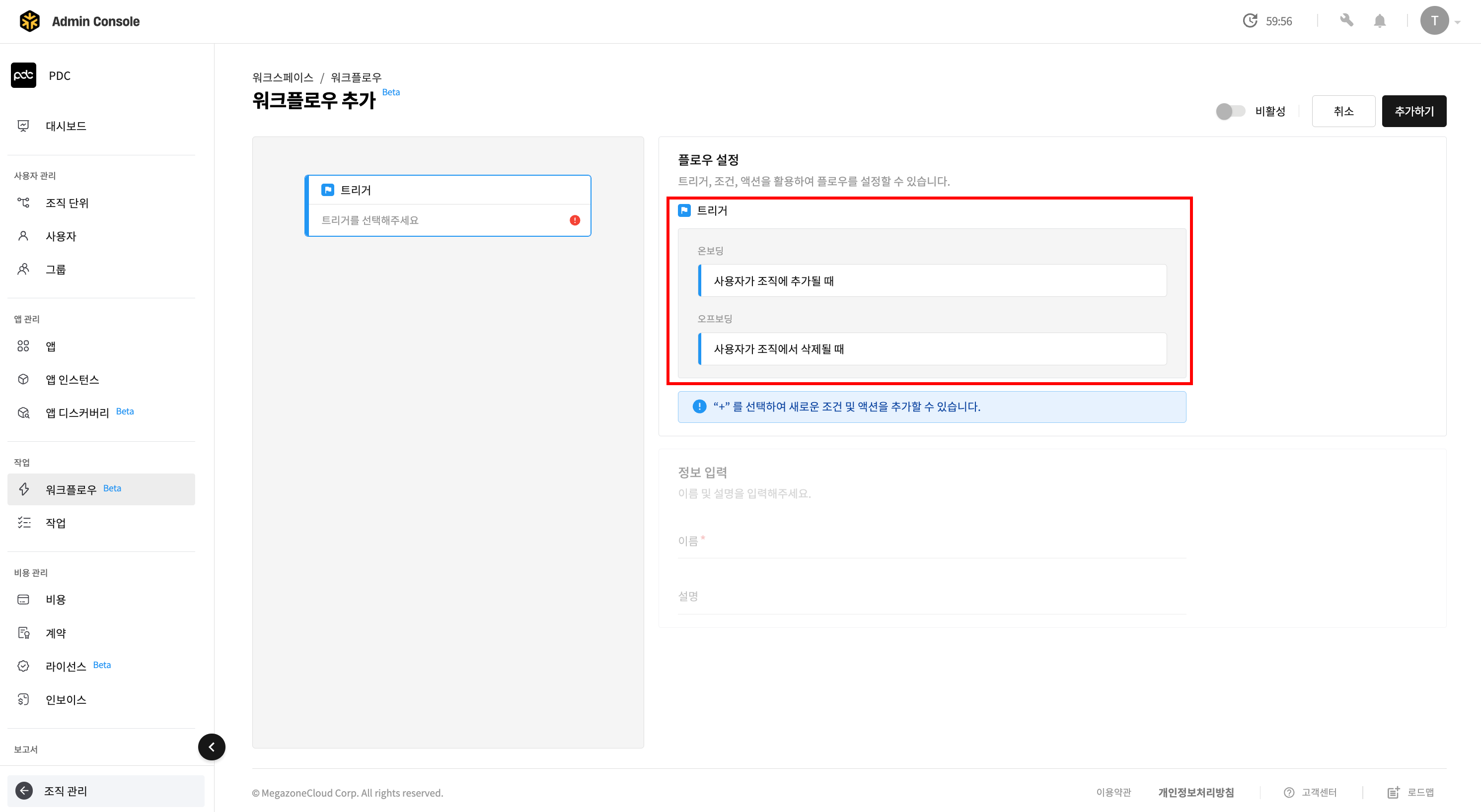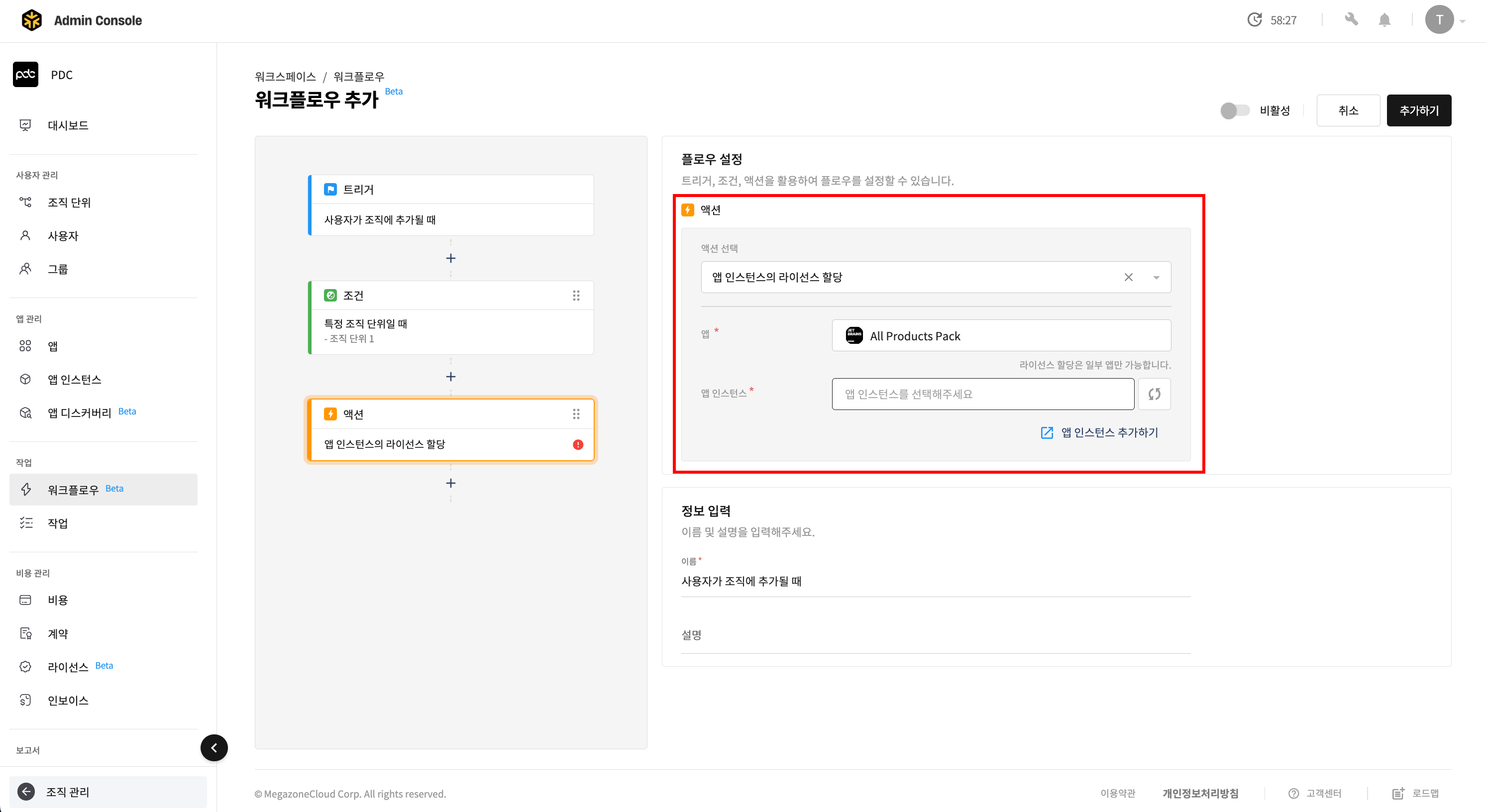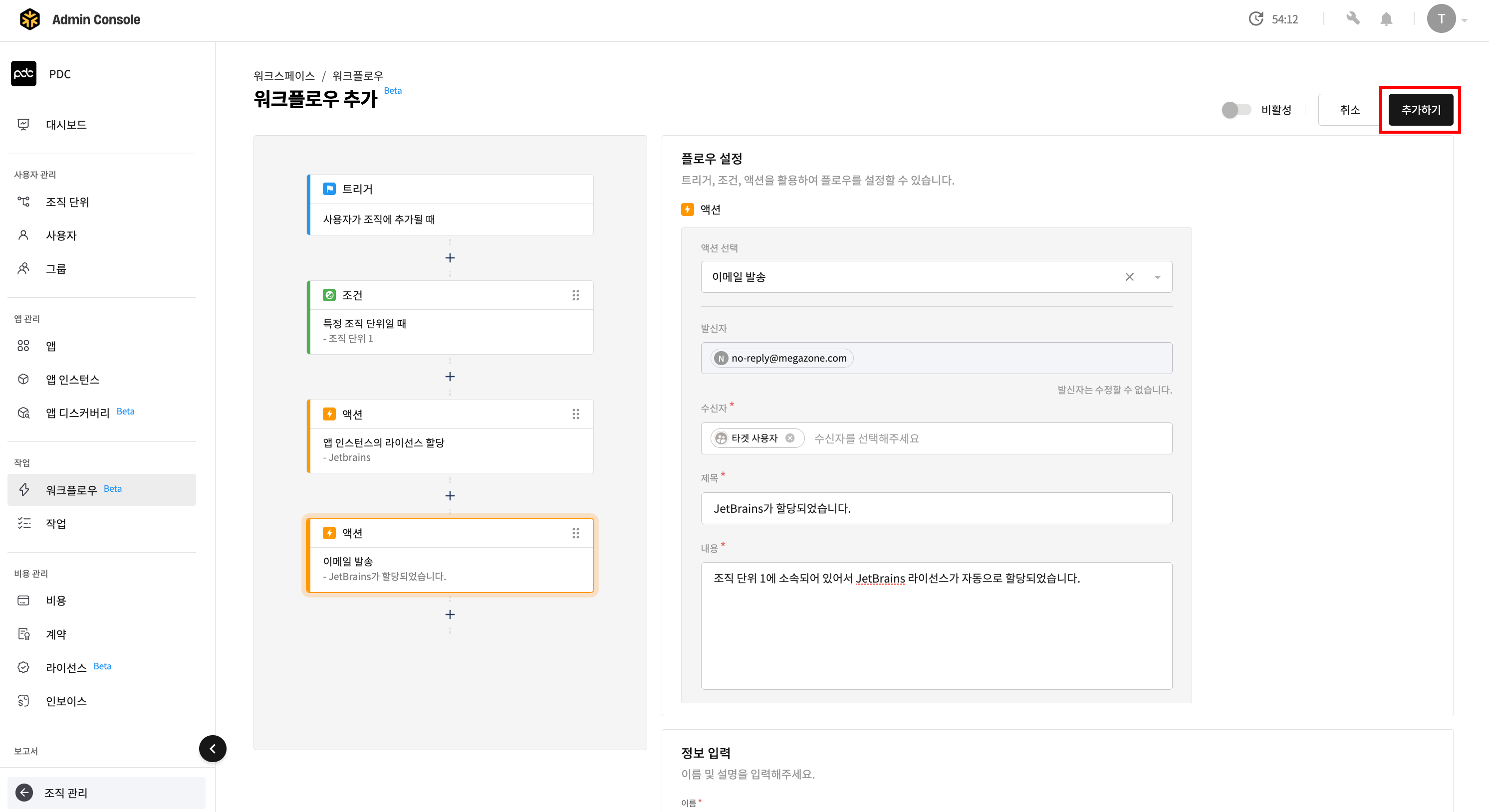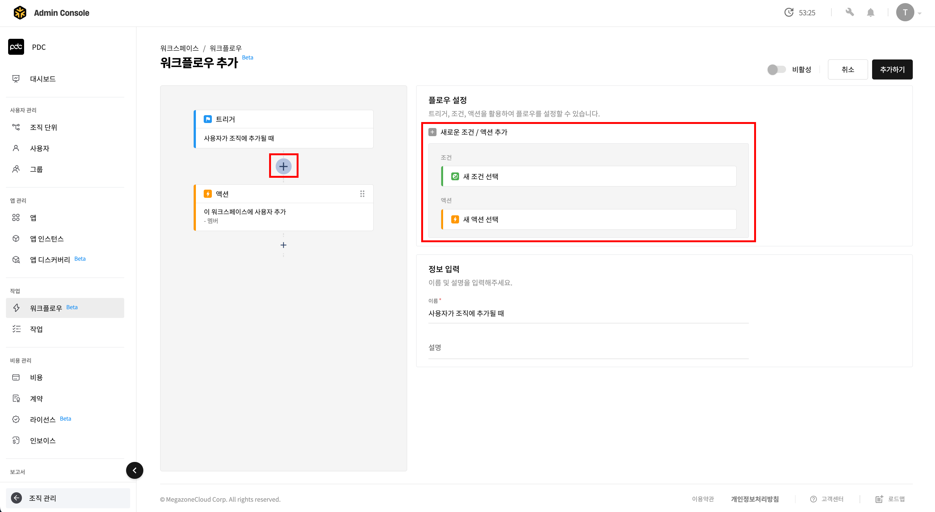 - 워크플로우 이름을 지정한 뒤 [추가하기] 버튼을 클릭하면 워크플로우가 추가됩니다.