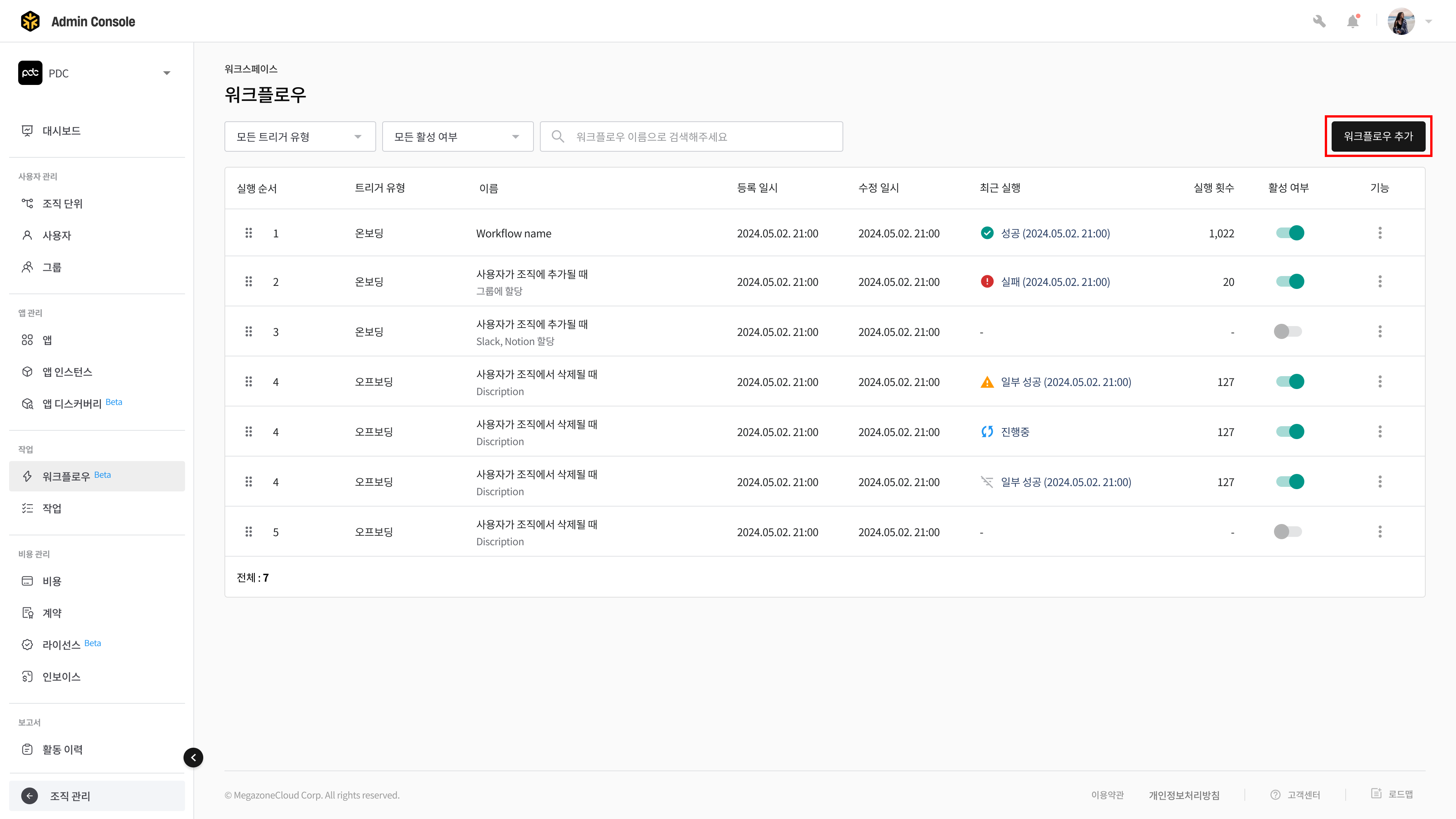 - 추가된 워크플로우는 워크플로우 목록 가장 상단에 추가됩니다. 필요에 따라 워크플로우 실행 순서와 활성 여부를 변경합니다.