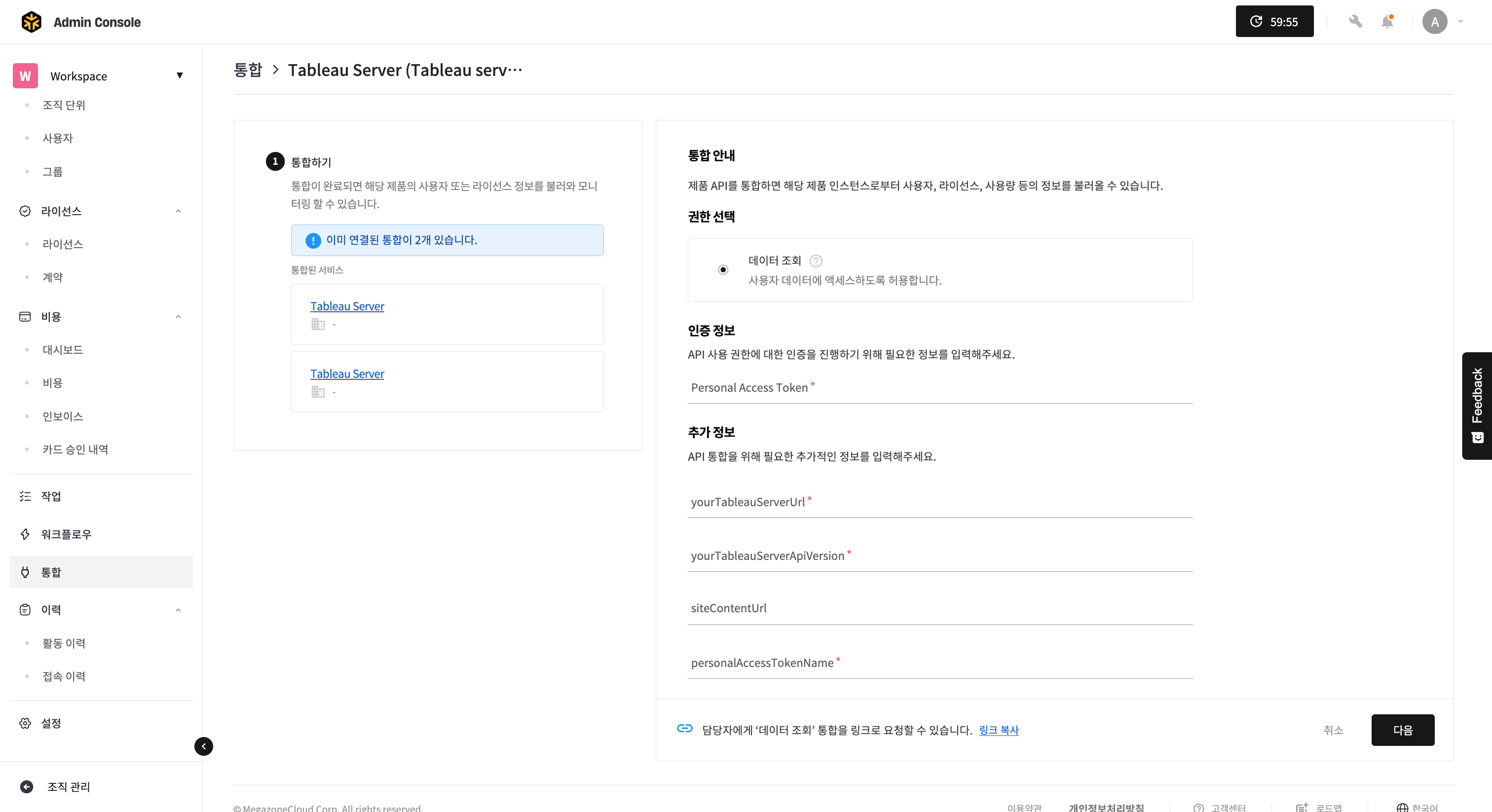 - Tableau Server 앱 인스턴스 상세 페이지에서 [통합] 탭으로 이동하여 사용자 통합의 [연결하기] 버튼을 클릭합니다.
