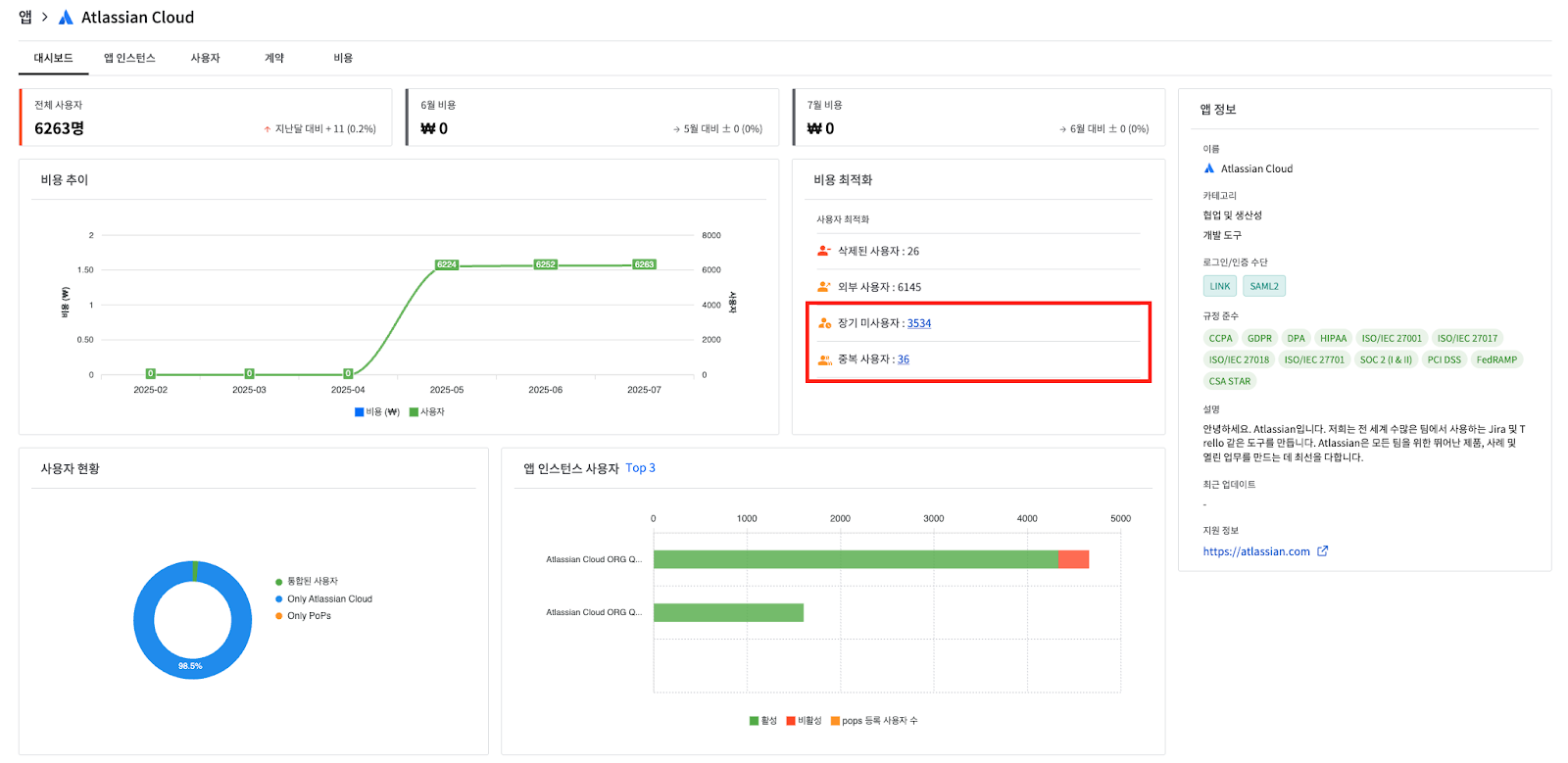 SaaS 자산 운영에서 비용 낭비를 유발하는 대표적인 요인인 중복 계정과 장기 미사용자를 쉽게 식별할 수 있도록 기능이 고도화되었습니다. 사용자별 앱 활용 현황을 앱·앱 인스턴스 대시보드에서 직접 확인하고, 불필요한 라이선스를 신속히 회수할 수 있습니다. 대시보드에서 중복 계정과 장기 미사용자를 한 번에 파악하고, 비용 절감을 위한 조치를 바로 실행하세요.