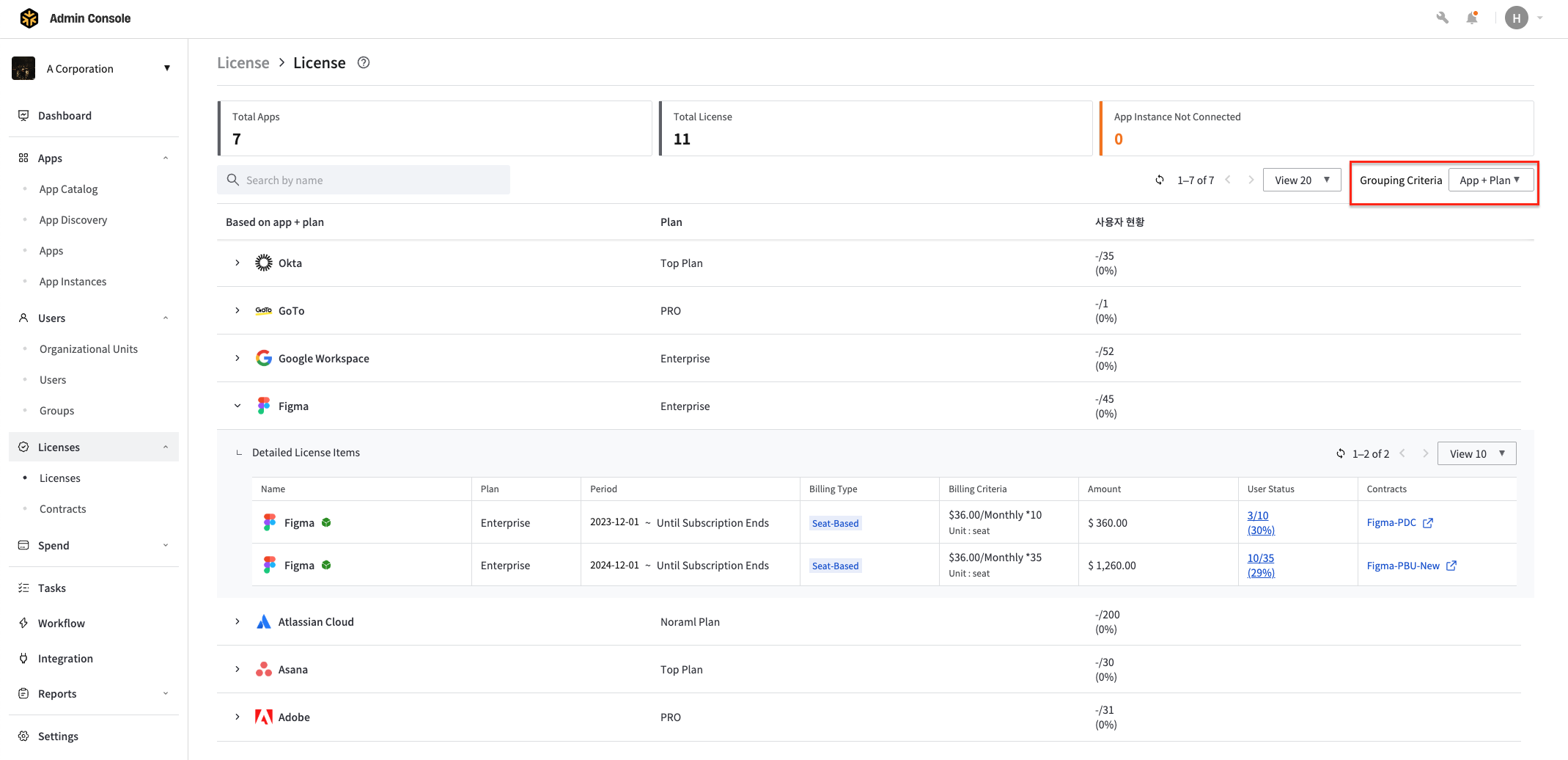 📊 라이선스 그룹핑 뷰 제공 – 동일 앱·플랜 기준으로 보유 수량을 한눈에 파악하세요.