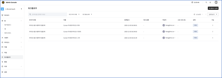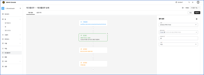 기존 워크플로우 기능의 제약 사항을 개선하여 좀 더 확장성 있고 사용하기 쉬운 노코드 기반의 워크플로우를 적용하였습니다. 이를 통하여 마지막 사용 일시를 기준으로 오래동안 사용하지 않는 사용자의 라이선스를 쉽게 직관적으로 회수할 수 있습니다.