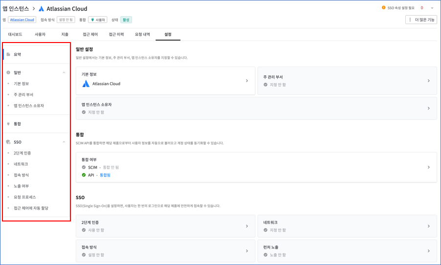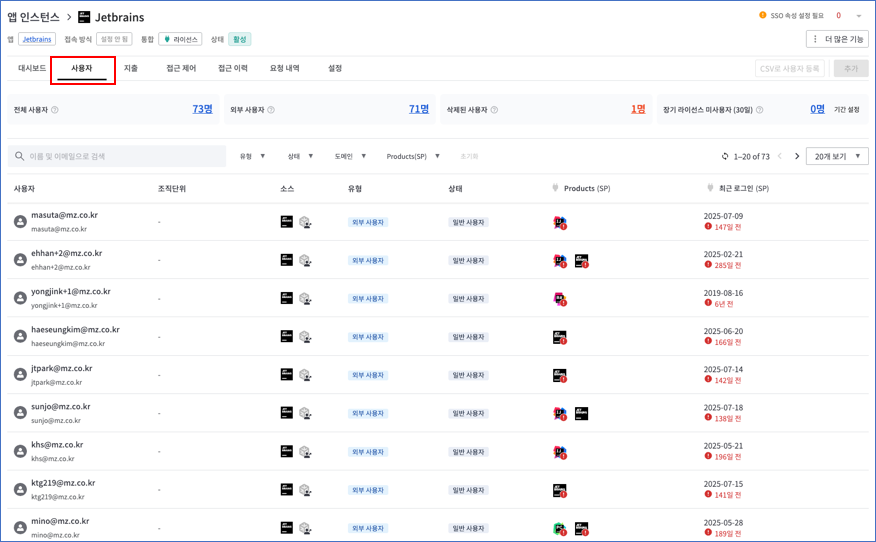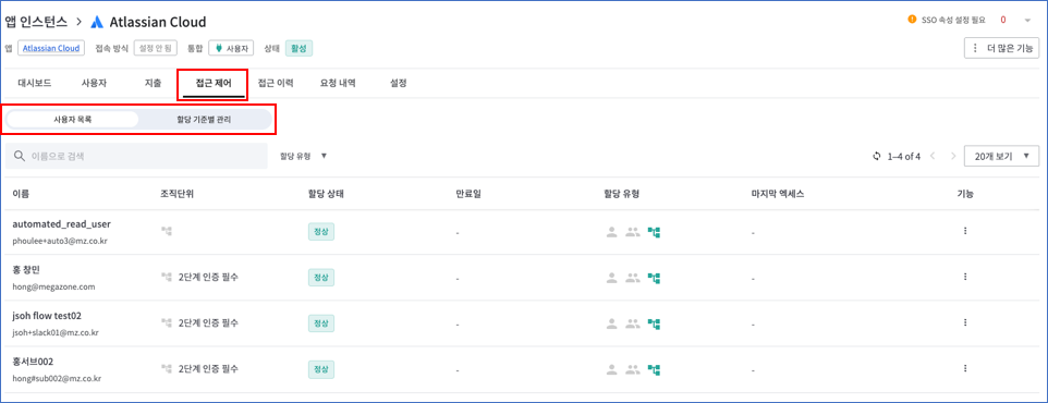 - “접근제어” 탭에 “사용자 목록”에는 SaaSOps SSO를 통하여 앱을 접근할 수 있는 사용자 목록을 보여줍니다. 이 페이지에서 SSO 통한 접근 권한을 부여하거나 회수할 수 있습니다.