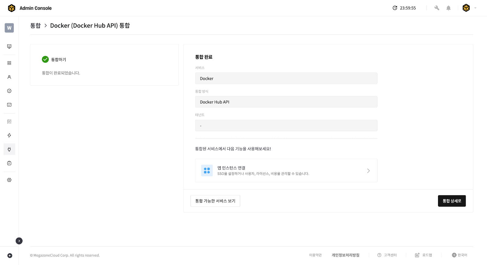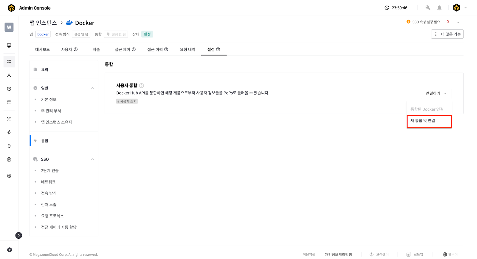Docker 앱 인스턴스 상세 페이지에서 [설정] 탭으로 이동하여 좌측 서브 메뉴의 [통합] 또는 통합 섹션의 [통합 여부]를 클릭하여 통합 페이지로 이동합니다.