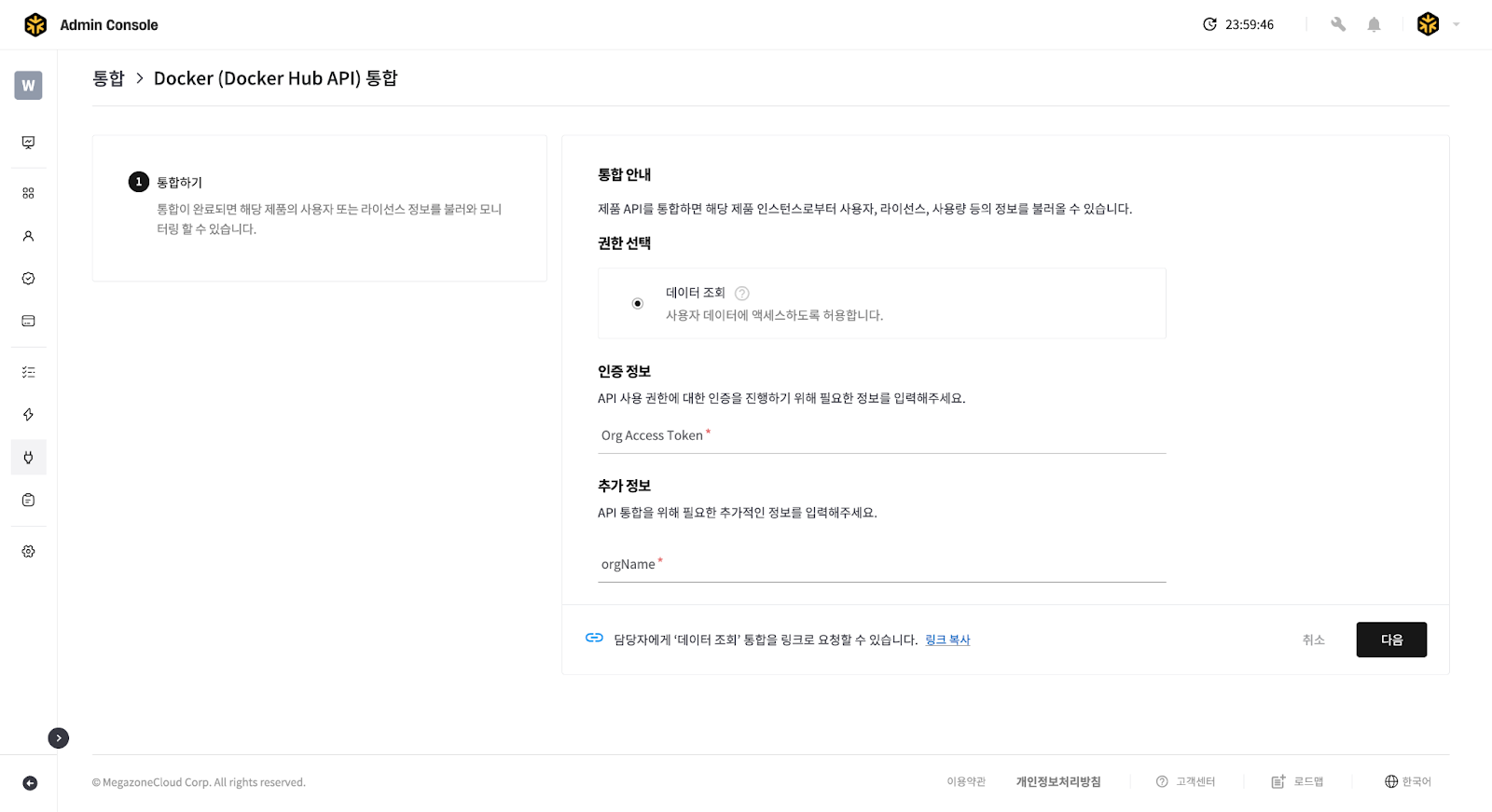 API 통합 다이얼로그가 노출되면 API 인증 정보[Org Access Token]을 입력 후 [다음] 버튼을 클릭합니다.