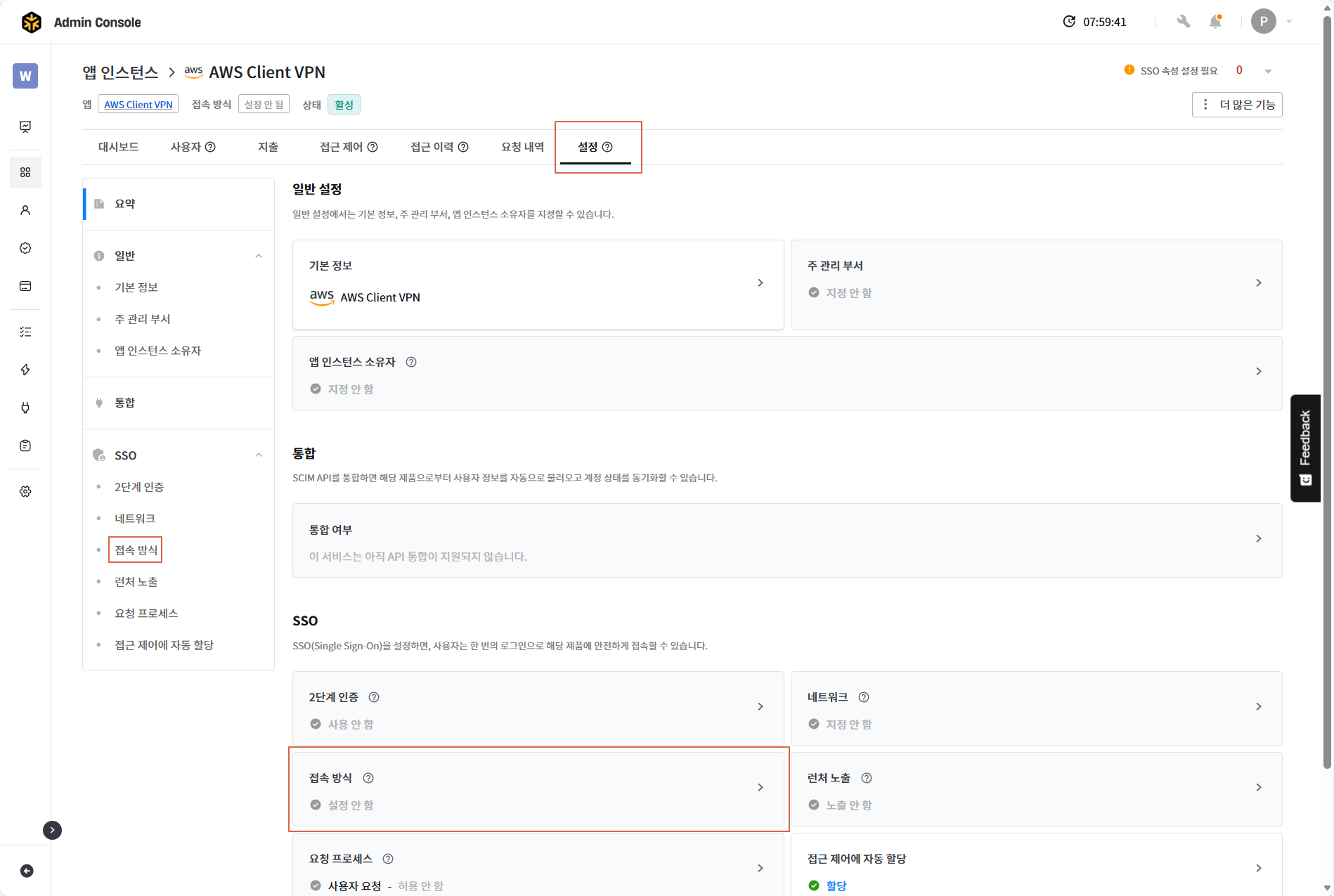 설정 탭으로 이동하여 좌측 서브 메뉴 또는 상세 화면의 [접속 방식]을 클릭하여 접속 방식 설정 페이지로 이동합니다.