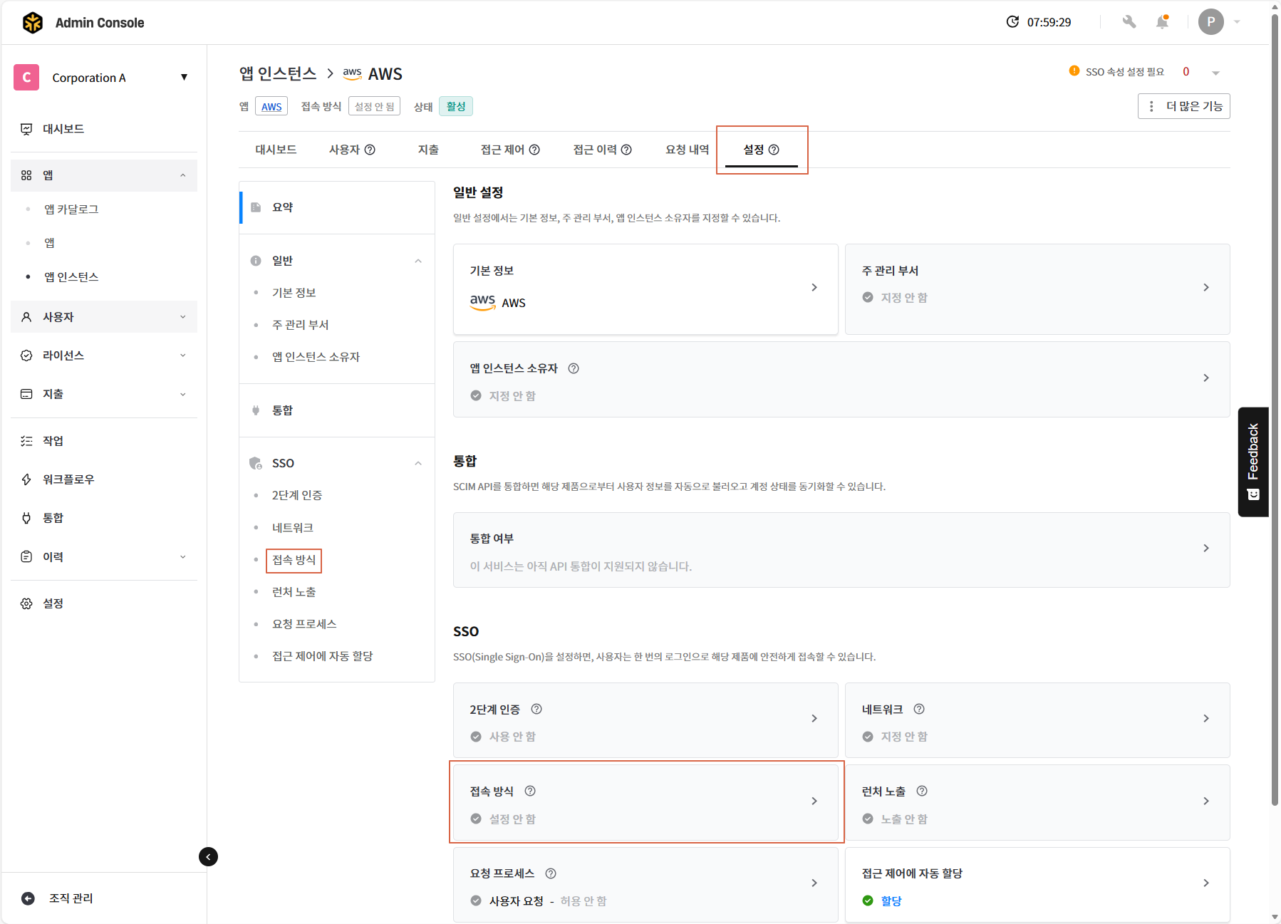 앱 인스턴스 상세 페이지로 이동하고, 설정 탭에서 [접속 방식]을 클릭 합니다.