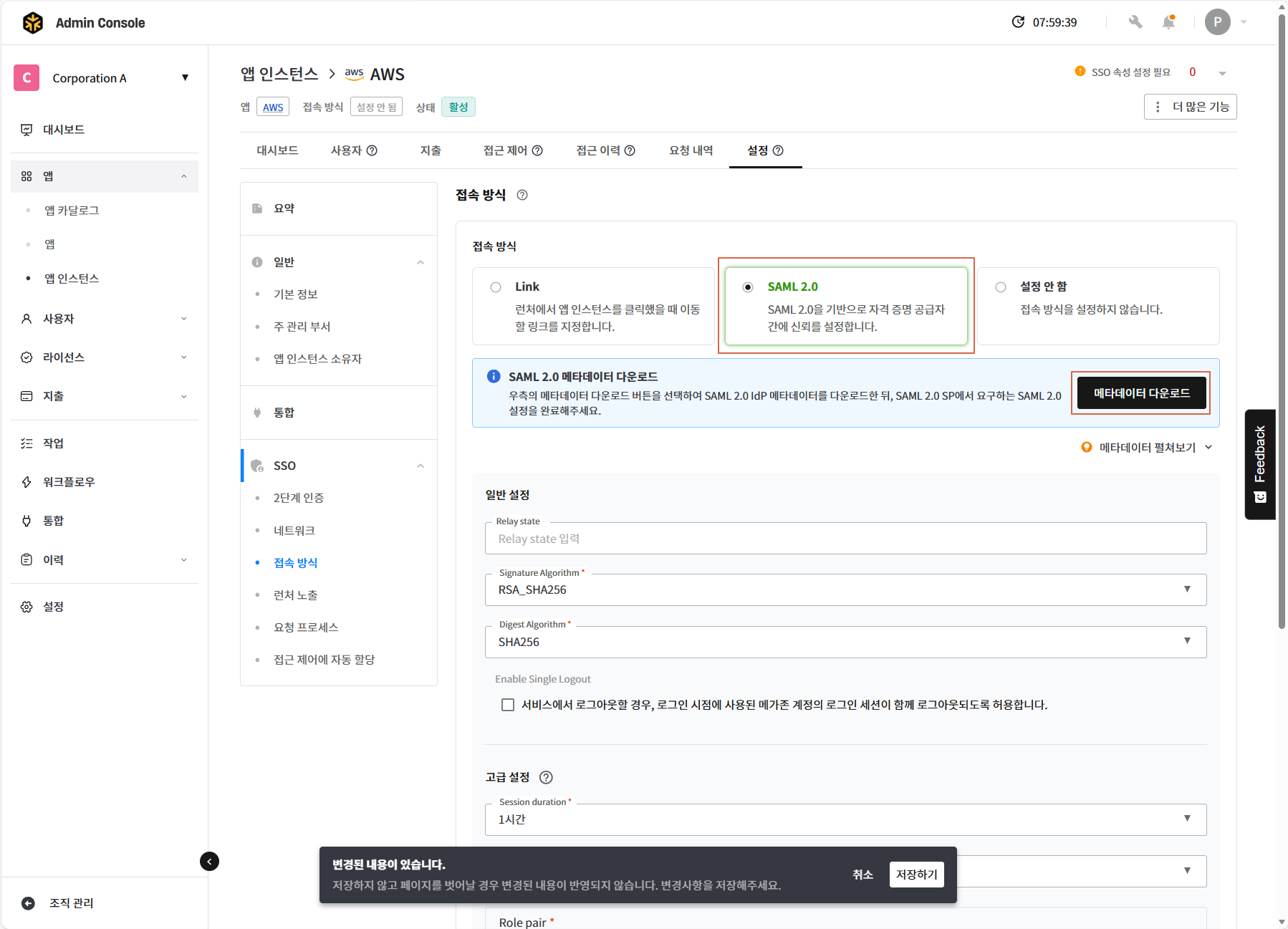 접속 방식 설정 화면에서 SAML을 선택하고 [메타데이터 다운]을 클릭하여 SAML IdP Metadata 파일을 다운로드합니다.