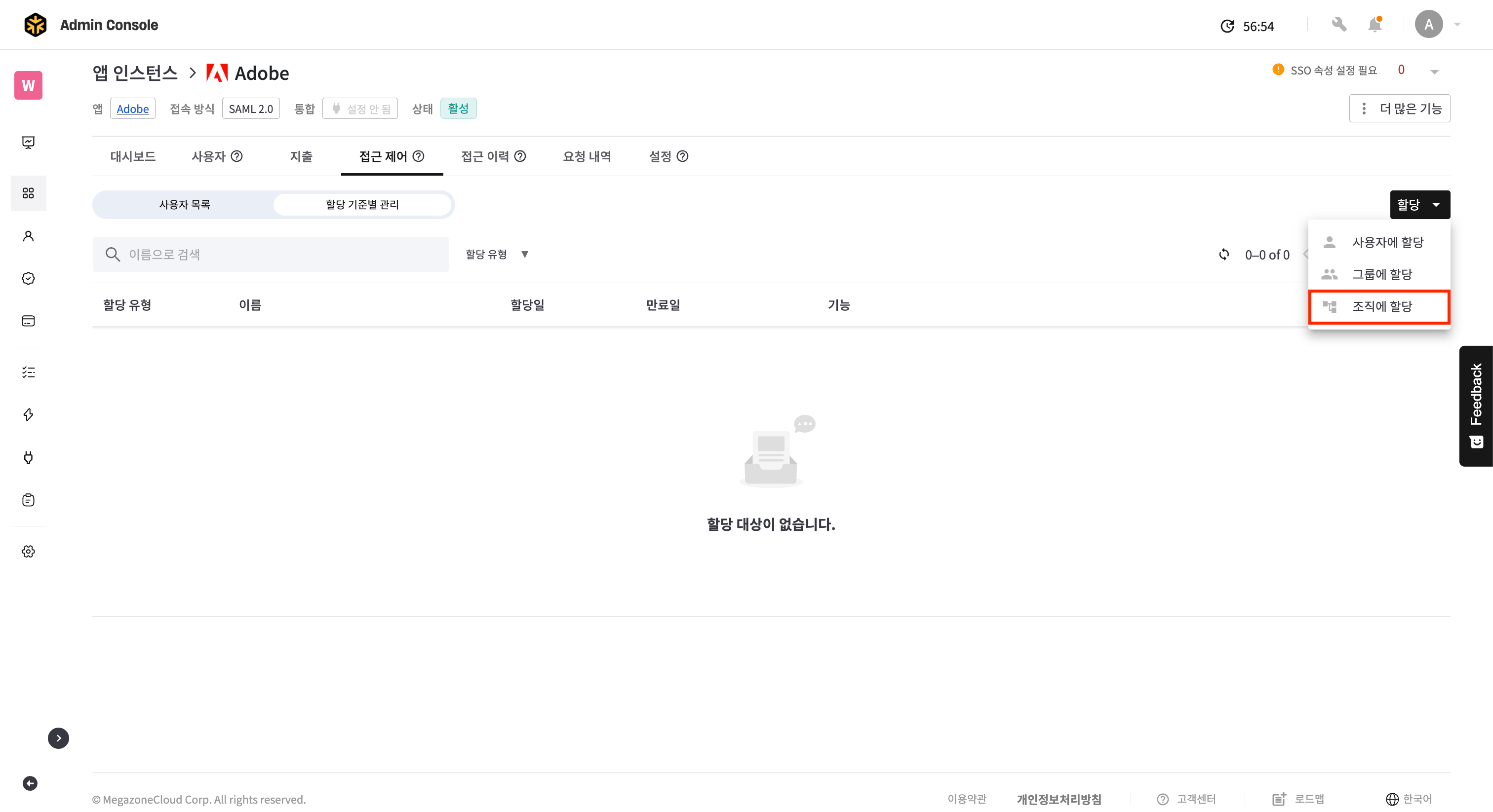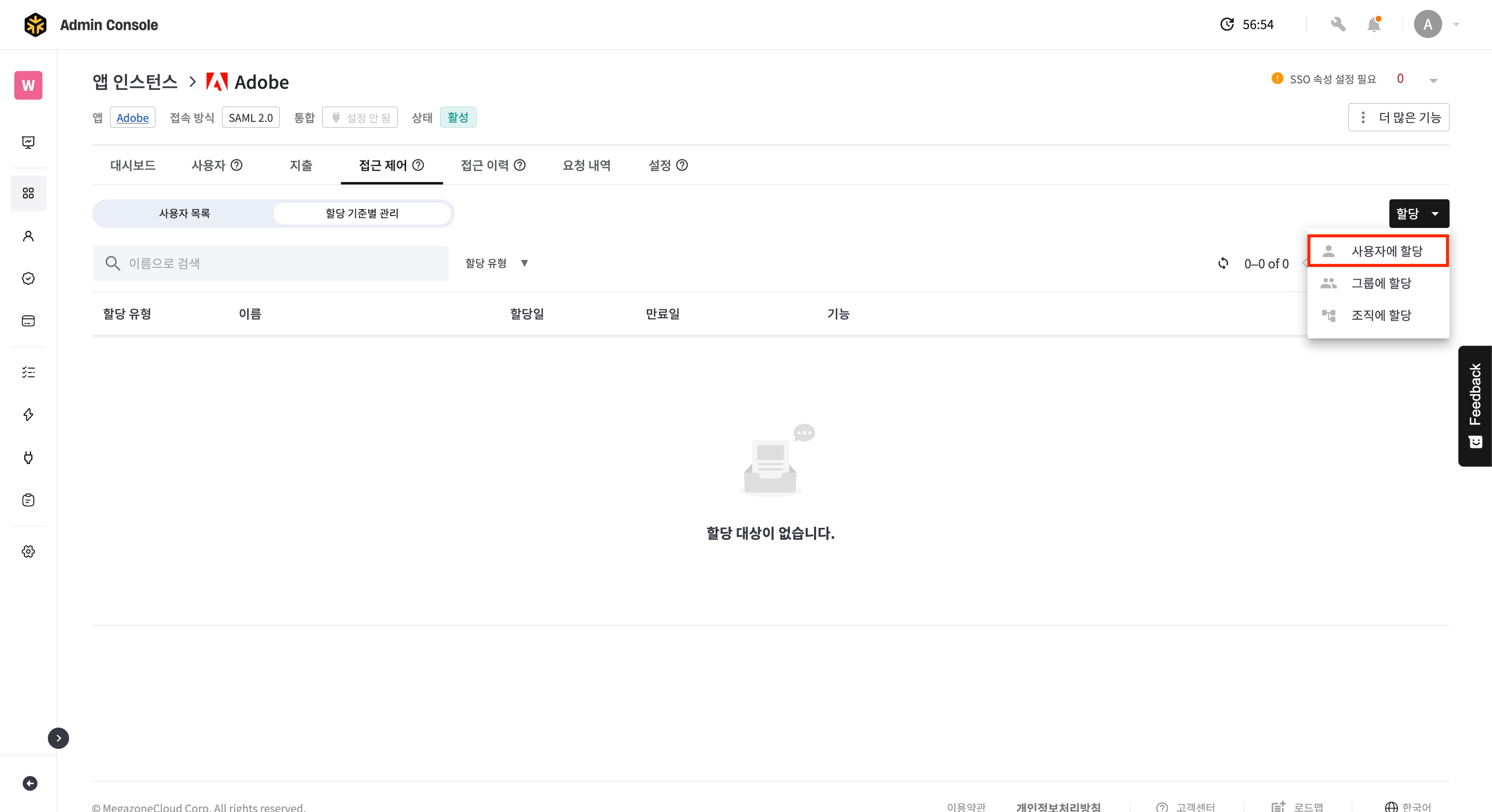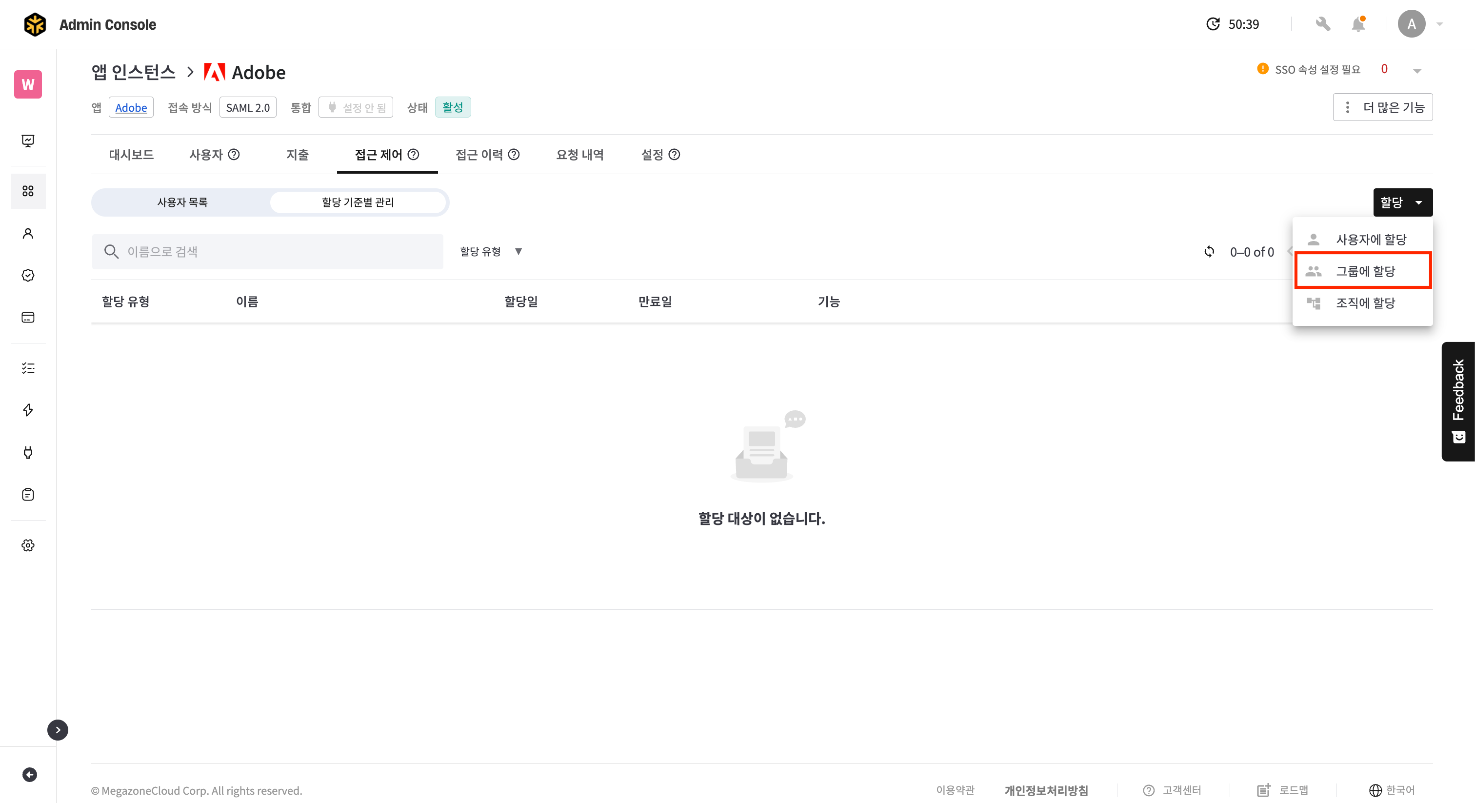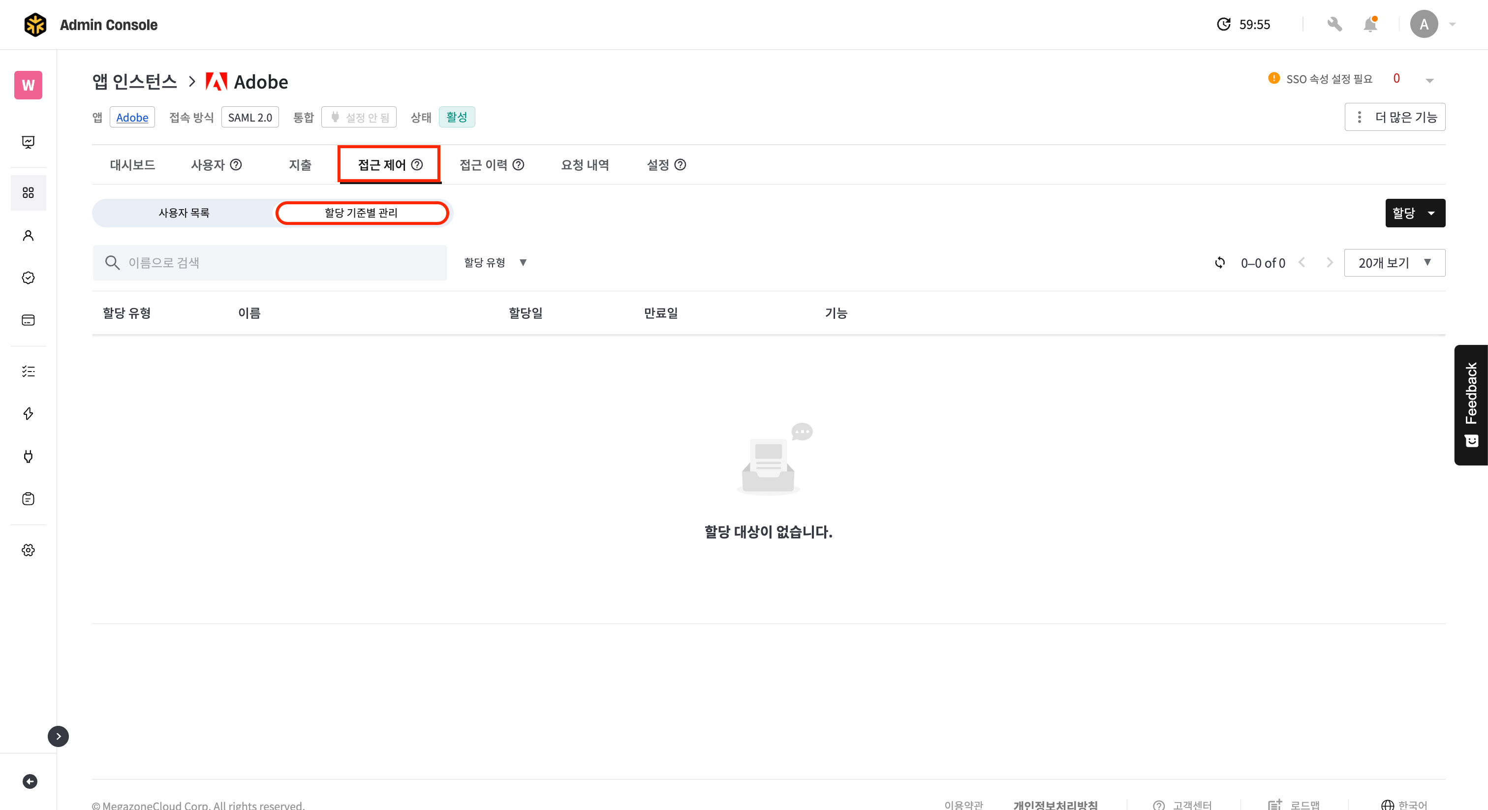 앱 인스턴스 상세 > 접근 제어 탭 > 할당 기준 별 관리 탭으로 이동합니다.