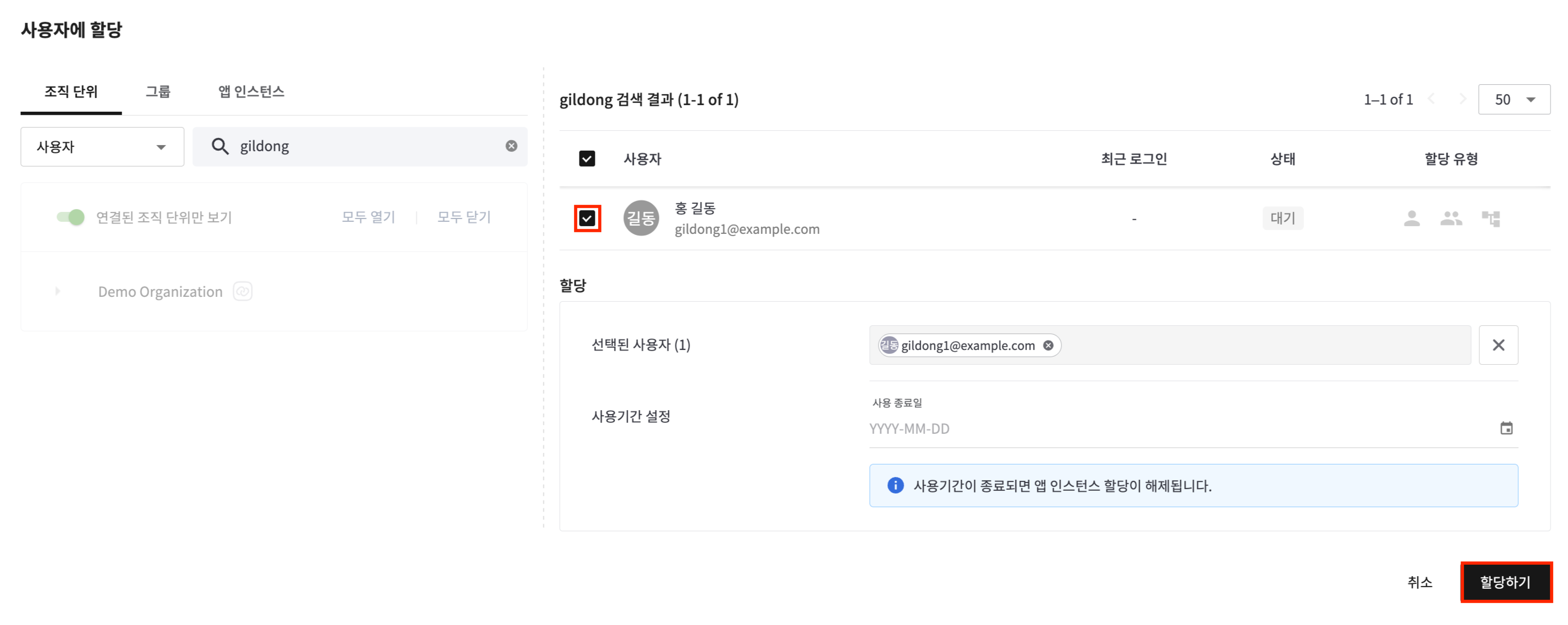 - 사용자 할당 다이얼로그에서 사용자를 검색 및 선택한 뒤, [할당하기] 버튼을 누르면 선택한 사용자에게 앱 인스턴스가 할당됩니다.