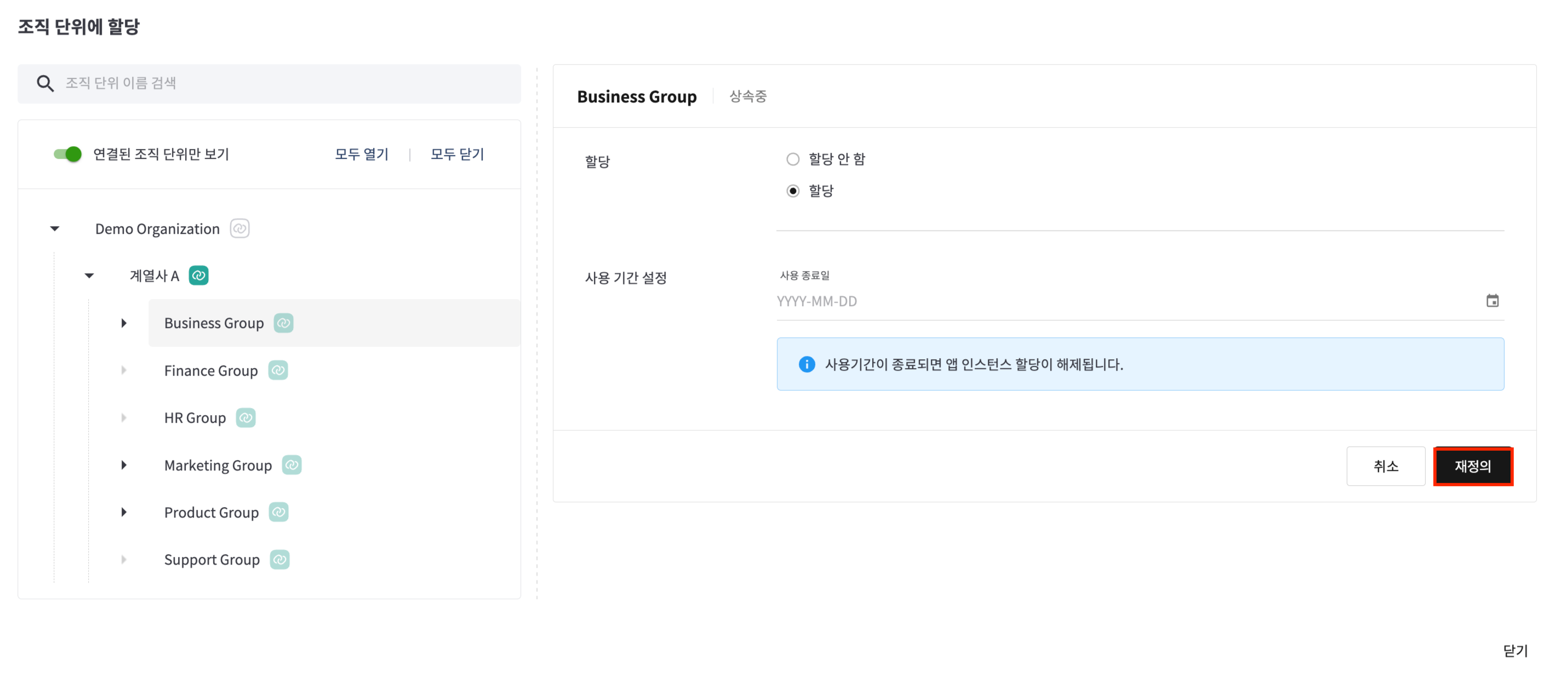 [할당] 버튼을 클릭 후, [조직에 할당] 버튼을 클릭하면 조직단위 할당 다이얼로그가 노출됩니다.